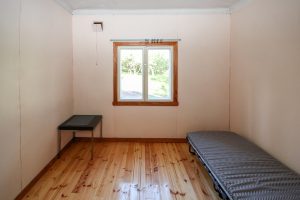 Stuga, sovalkov, kök och bastu. |